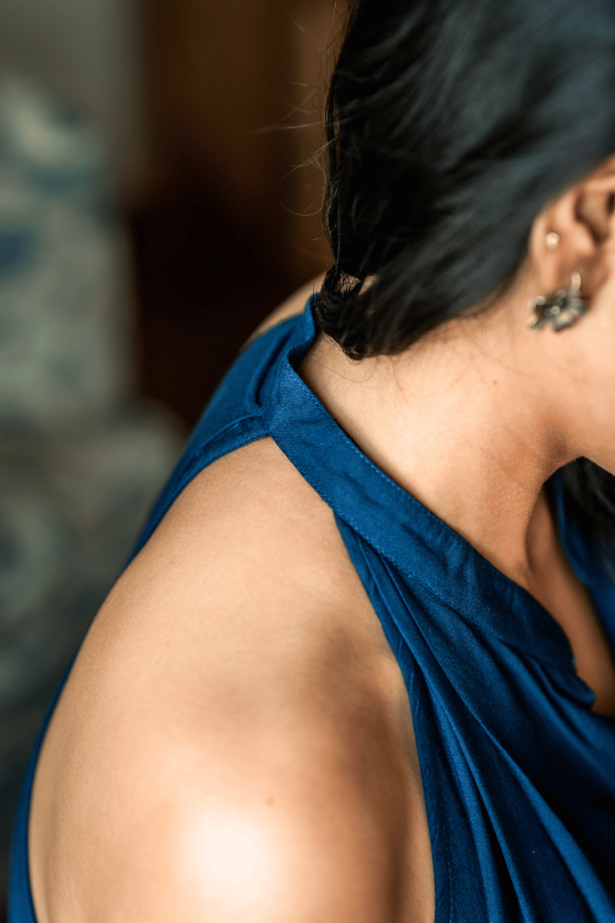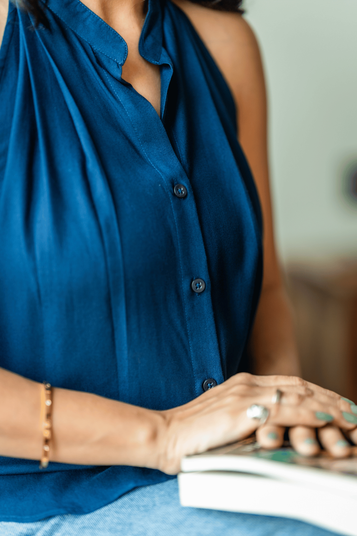 Halter neck navy shirt top made in rick bamboo fabric. Front open with buttons, curved hem and a back box pleat. It feels as soft on your skin as it is on the planet.